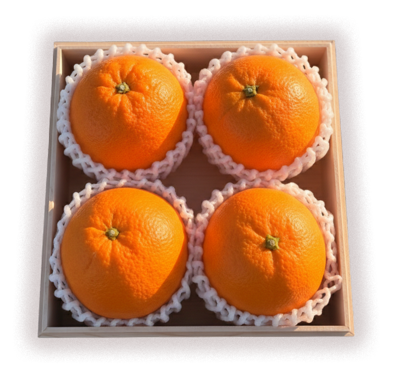 温暖な気候と潮風に育まれたネーブルは、やさしい甘みとほどよい酸味、みずみずしい果汁が特長。手のひらにずっしりと収まる、直径約8.5cm前後の果実を一玉ずつ丁寧に木箱へ詰めてお届けします。
