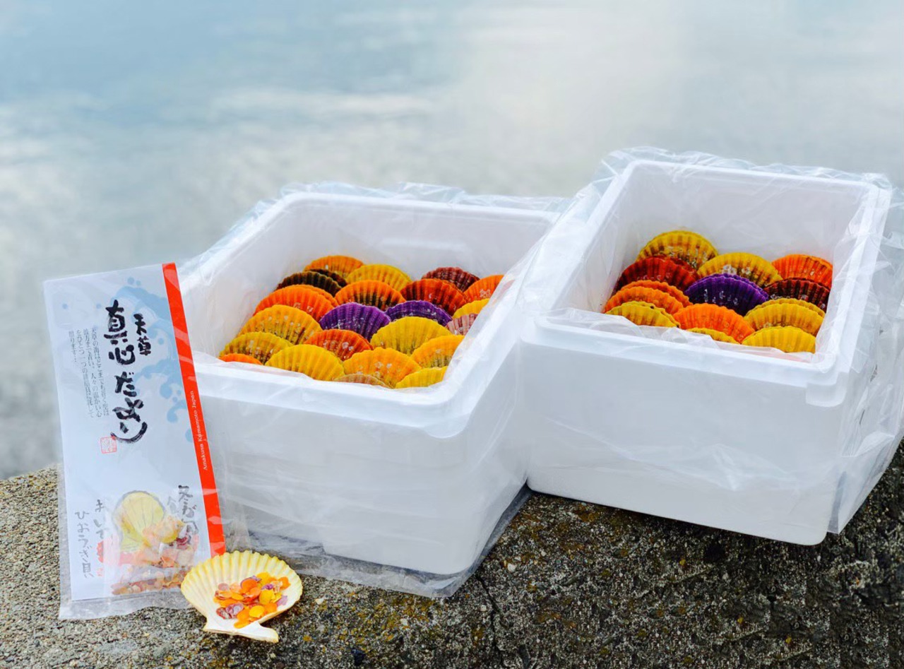 緋扇貝(ひおうぎかい)の養殖は、1984年(昭和59年)より、養殖をスタート。人工採苗で卵から孵化をさせ、約2年間天草灘・苓北の海で育ち、皆様のもとへお届けしております。丹精こめて育てております。多色多彩な貝殻は無着色!!赤・オレンジ・黄色・紫・茶色と、とても綺麗な色です。育てるにあたっては消毒薬などの薬品は一切使用しておりません。出荷時に、紫外線殺菌した無菌海水の特殊な流れの中で、約12時間飼育することにより、高品質な貝を生産しておりますので、安心してご利用ください。ホタテ貝によく似たとても色鮮やかで、甘く美味しい貝です(^^)出荷の時期は、11月~2月末ごろまでです。ご贈答・ご自宅用にいかがでしょうか☆♪皆様のご注文、心よりお待ちしております!